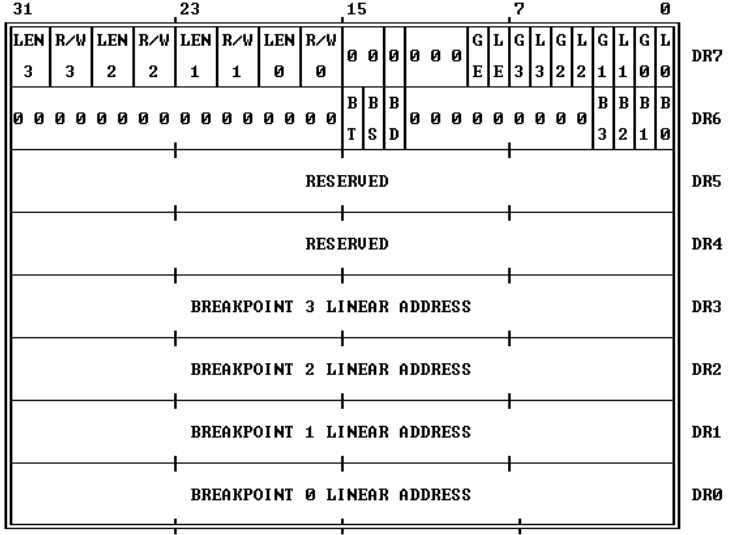 - Dr0 a Dr3, que almacenan las direcciones de memoria donde se colocan los breakpoints.