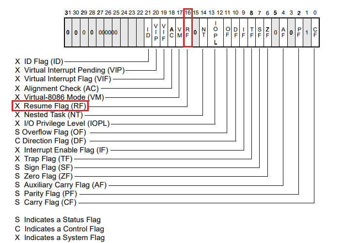 La siguiente figura muestra la distribución del registro EFLAGS y la posición exacta del Resume Flag (RF) resaltado en rojo: